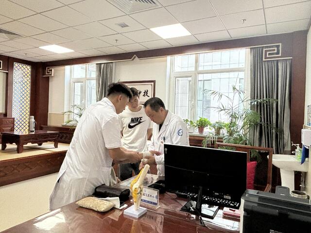 在内蒙古民族大学附属医院的特需诊室内,主任医师阿其拉吐正在轻声安慰一名手臂受伤的小男孩。在仔细查看了孩子手臂的片子后,他开始进行正骨治疗。只见他拿起酒壶向孩子受伤的胳膊喷了几口酒并按摩几下之后,孩子很快就停止了哭闹并表示没有那么疼了。“刚才我使用的就是蒙医正骨治疗,蒙医正骨是蒙医药学中的一种特色疗法,它以手法复位、夹板固定、功能锻炼为主要治疗方法,使用蒙医正骨有很多优势,疗效好、愈合快……”阿其拉吐说。